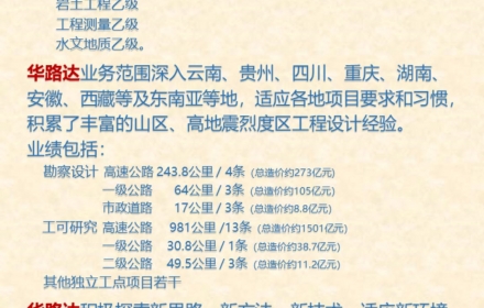 目前公司业务范围已深入云南、贵州、四川、重庆、湖南、安徽、西藏等及东南亚等地,对各地特殊要求及习惯做法均能适应,积累了大量的山区、高地震烈度地区高等级公路设计经验。