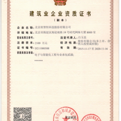 公司相关资质齐全,拥有建筑智能化工程专业承包资质、安防工程企业壹级资质、计算机系统集成资质、音视频壹级资质、1SO9001质量/环境/职业健康安全管理体系认证等多项证书。是国家高新技术企业、中关村高新技术企业、中关村瞪羚企业、海淀区海帆企业,是北京安防协会常务理事单位。