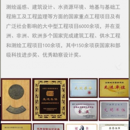 建设综合院服务范围全面,专业结构合理,技术力量雄厚,实践经验丰富,具备承担各种大型、特殊或复杂工程项目的能力。建院近60年来,先后完成岩土工程、测绘遥感、建筑设计、水资源环境、地基与基础工程施工及工程监理等方面的国家重点工程项目及有广泛社会影响的大中型工程项目6000余项,并在亚洲、非洲、欧洲多个国家完成建筑工程、供水工程和测绘工程项目100余项。其中70余项获国家和部级优秀勘察设计奖。