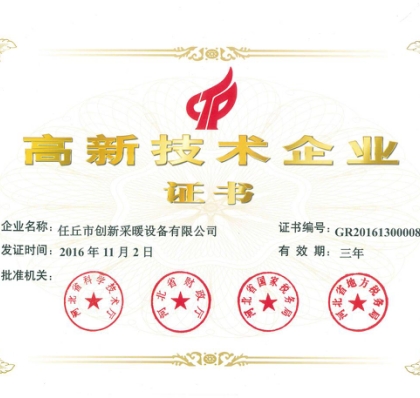 2014年获得“国家环保认证产品” “绿色环保首选产品” “低碳节能环保重点保护产品” “节能环保优质产品” 取得燃气锅炉生产许可证书,荣获河北省政府、北京市政府、天津市政府补贴清洁燃烧炉具中标产品和企业。