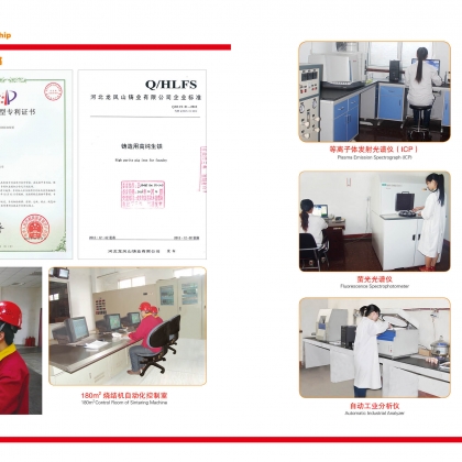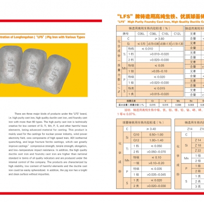 Longfengshan applies independently researched and developed "Three Refinement Method", that is fine pretreatment of raw materials, refine smelting and secondary iron melt refine treatment, to make high purity foundry pig iron and super high purity pig iron. These high quality pig irons have filled the gaps in homemade pig irons and realized replacement for imported products. During the production process, whole process quality control and many very strict standards are performed. The pig irons made by this process contain very low harmful elements, very small variation in chemical composition, therefore, are irreplaceable materials for high end castings.
