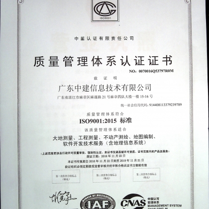 广东中建信息技术有限公司成立于2015年5月,为有限责任公司,公司注册资金1000万元,现有从业人员100名。公司已取得乙级测绘资质、ISO9001质量管理体系认证、一批GIS行业软件著作权。