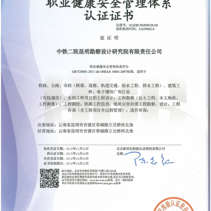 昆明公司属于综合勘察设计企业,持有国家铁道综合甲Ⅱ级(含电气化)设计资质;建筑行业建筑工程甲级资质;铁路、市政公用工程(市政交通)、岩土工程、工程测量、工程造价咨询、工程勘察专业类岩土工程等十余项甲级资质。昆明公司于2012年通过管理体系外部审核,获得“质量、环境、职业健康安全管理体系”三标一体认证证书。