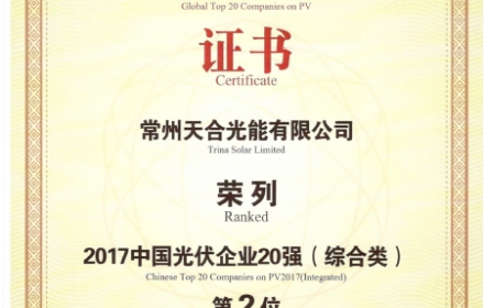 天合光能借助遍布于亚洲、欧洲、北美的营销网络以及安装商、合作伙伴,致力于打造一个可持续发展的光伏企业样板。公司高品质的光伏产品,给世界各地的民用、商用、公用以及大规模公共设施带来清洁、可靠的太阳能。2016年,天合光能获评彭博新能源财经(BNEF)“全球最具融资价值组件品牌”。BNEF在全球范围针对50个主要组件品牌进行问卷调查,调查结果显示,天合光能的组件相较其他品牌更容易获得贷款融资,天合光能的组件品牌得到了全球范围的广泛认可。