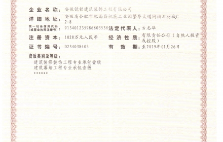 安徽镜铭建筑装饰工程有限公司是一家专业从事建筑幕墙设计、施工的一级资质企业。公司拥有住建部核准颁发多项资质,成功服务多家大型企业,并荣获多项荣誉。公司秉承“客户第一、质量第一、信誉第一”的宗旨,倡导绿色节能新体系。公司自建立以来,以打造国内一流加工与安装为一体的大型幕墙工程企业为目标。