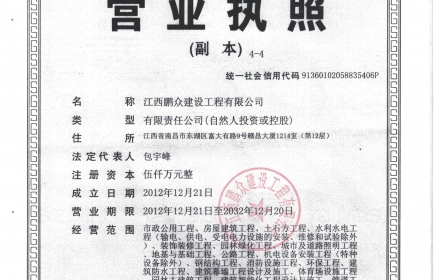 江西鹏众建设工程有限公司成立于2012年12月,隶属于南昌市城乡建设委员会,具有江西省住房和城乡建设厅颁发的“建筑工程施工总承包”“市政公用工程施工总承包”“建筑装修装饰工程专业承包” 等多种资质的综合施工企业;