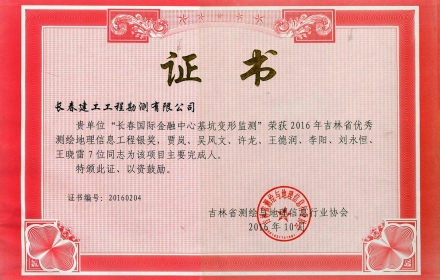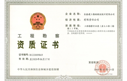 我司持有中华人民共和国住房和城乡建设部颁发的工程勘察专业类(岩土工程(勘察))甲级资质;吉林省住房和城乡建设厅颁发的工程勘察专业类(水文地质勘察、工程测量、岩土工程(设计,物探测试检测监测))乙级资质;劳务类(工程钻探、凿井);国家自然资源部颁发的测绘甲级资质,吉林省住房和城乡建设厅颁发的地基基础工程检测资质,并于2008年通过IS019001质量管理体系认证。