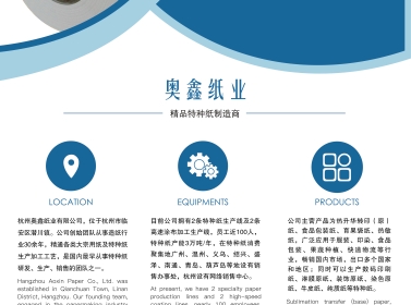 杭州奥鑫纸业有限公司,位于杭州市临安区潜川镇。公司创始团队从事造纸行业30余年,精通各类大宗用纸及特种纸生产加工工艺,是国内最早从事特种纸研发、生产、销售的团队之一。